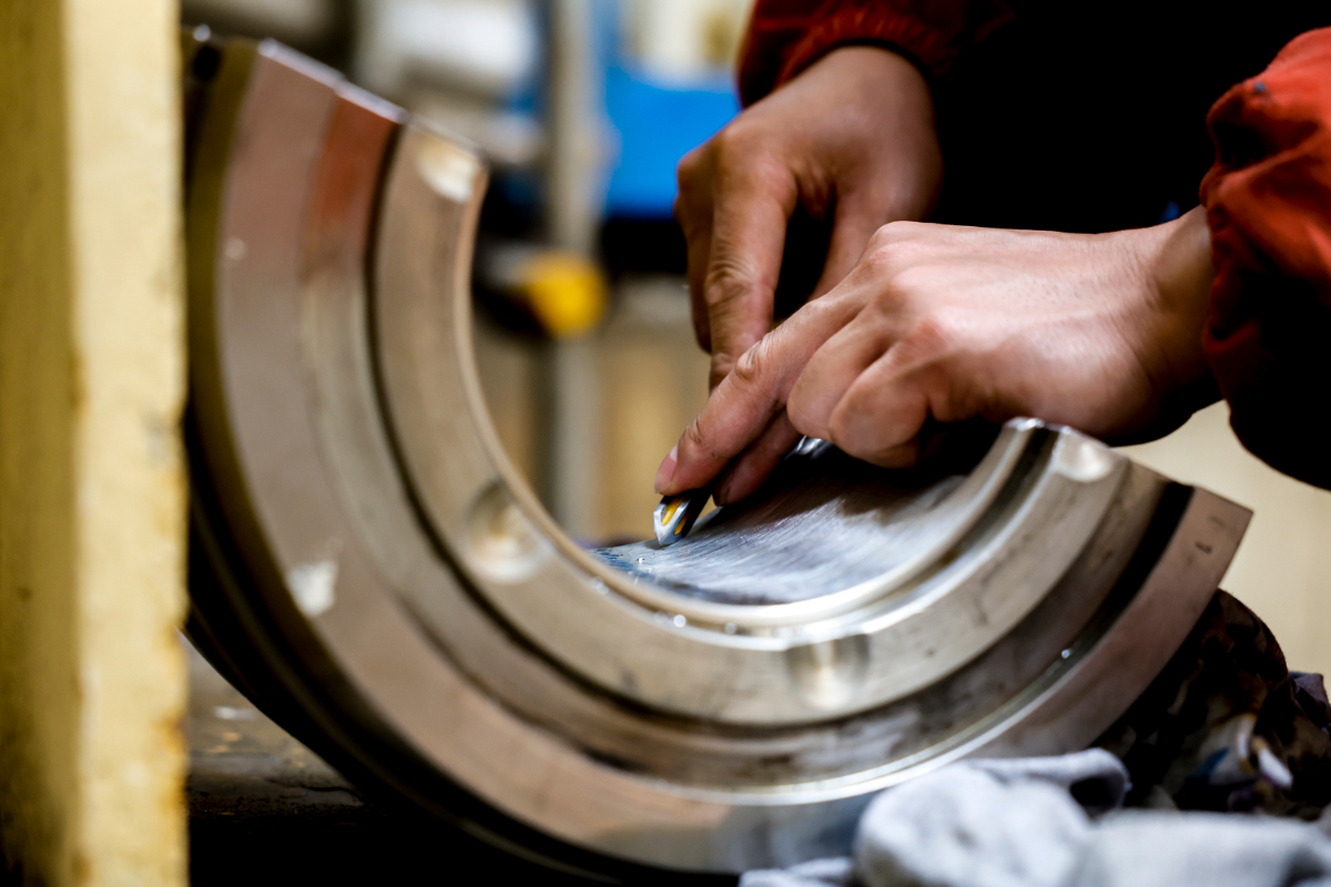 嘉电检修人员手持“柳叶刀”进行轴瓦修刮。 王侃 摄