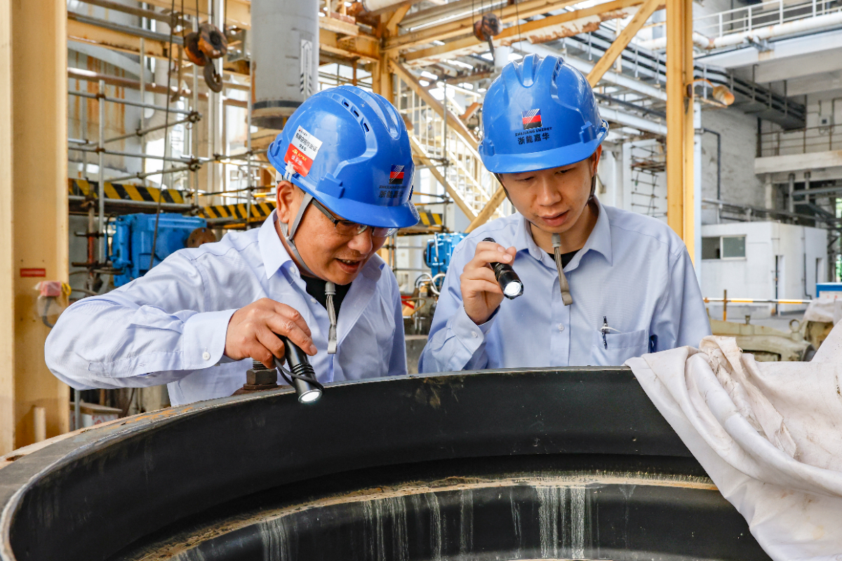 嘉电维护部锅炉四班班长徐永忠与锅炉专业组长沈忠明检查零部件。 王侃 摄