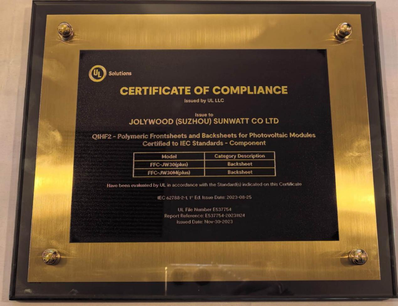 荣获UL Solutions全球首张“光伏组件用背板IEC 62788-2-1认证证书。 中来股份 提供