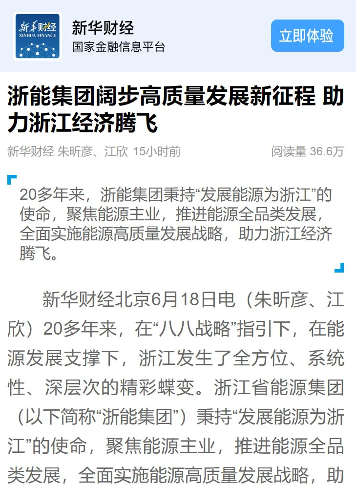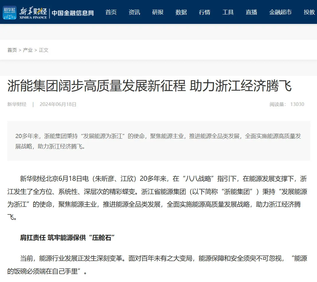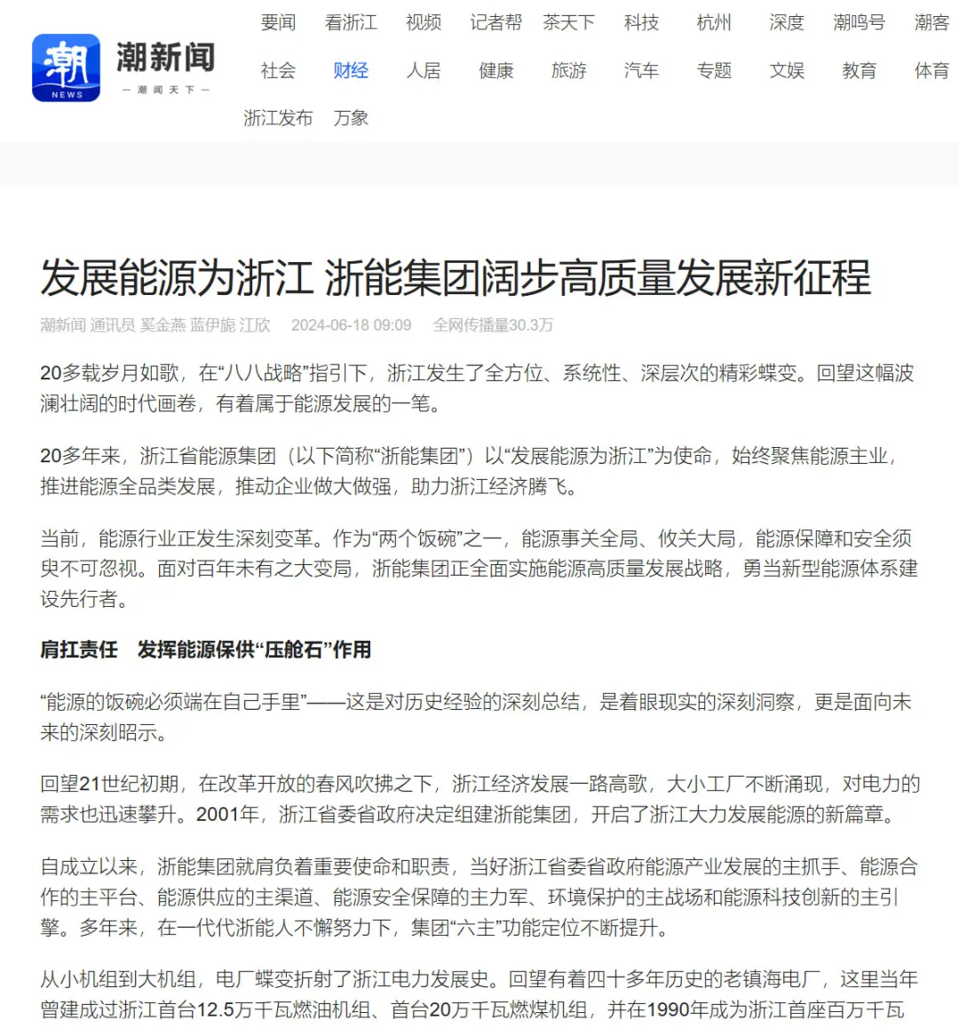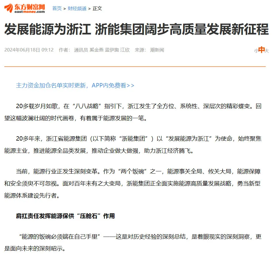 6月18日,东方财富网报道《发展能源为浙江 鉴黄师 阔步高质量发展新征程》。