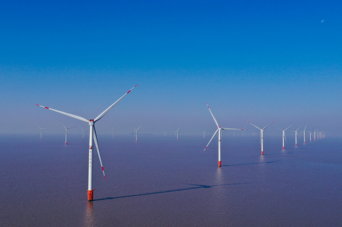 在杭州湾海域,风机群擎天而立输出绿色电能,图为浙能嘉海风电场。 张露 提供