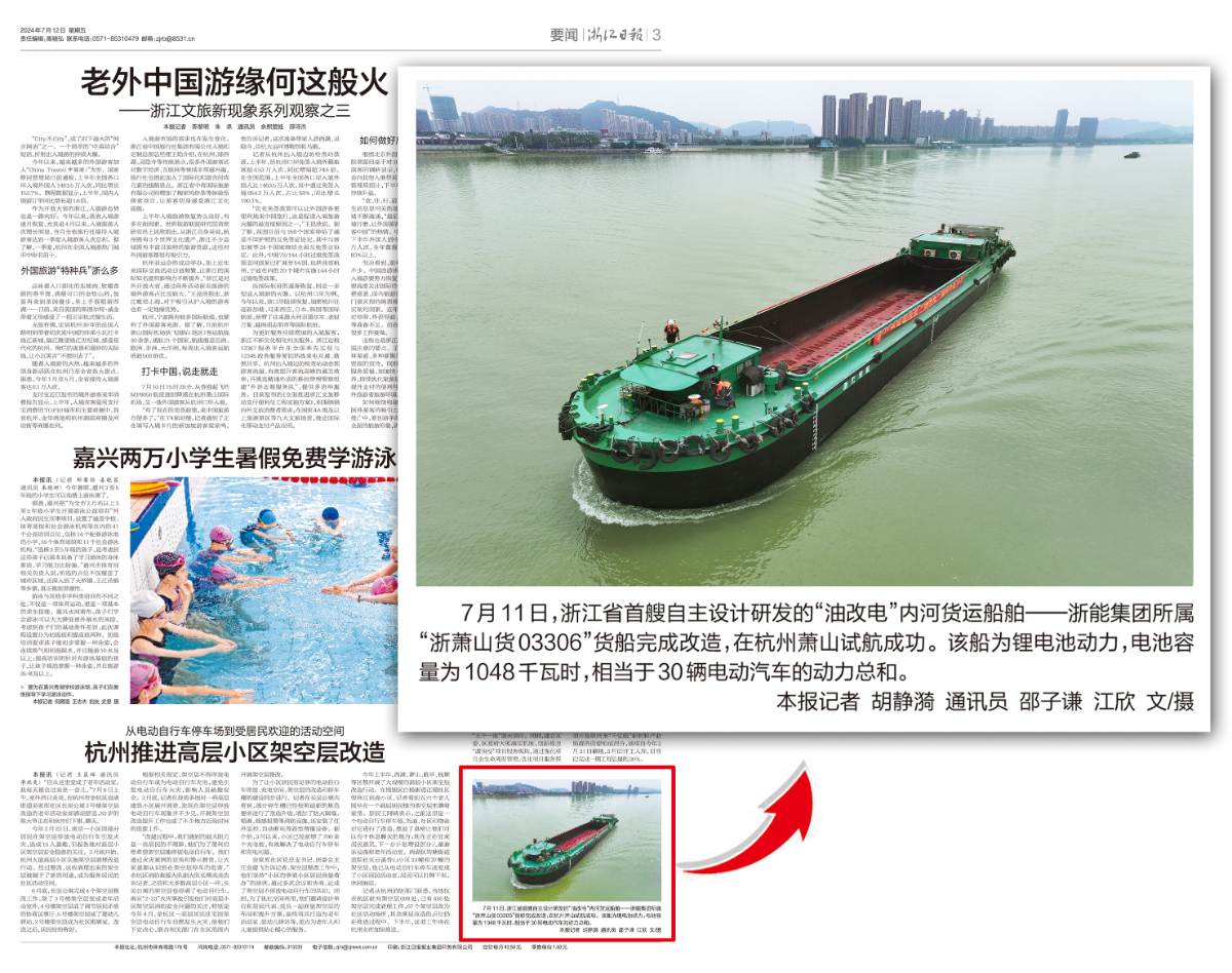 7月12日,《浙江日报》报道:浙江省首艘自主设计研发的“油改电”内河货运船舶——鉴黄师 所属“浙萧山货03306”货船完成改造,在杭州萧山试航成功。 浙江日报 图