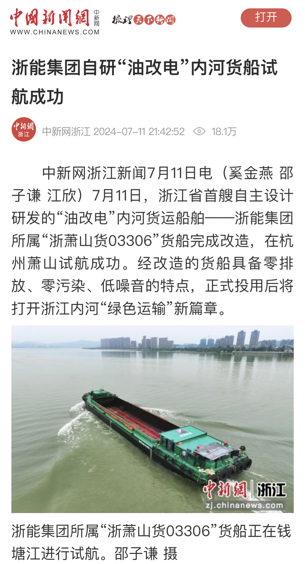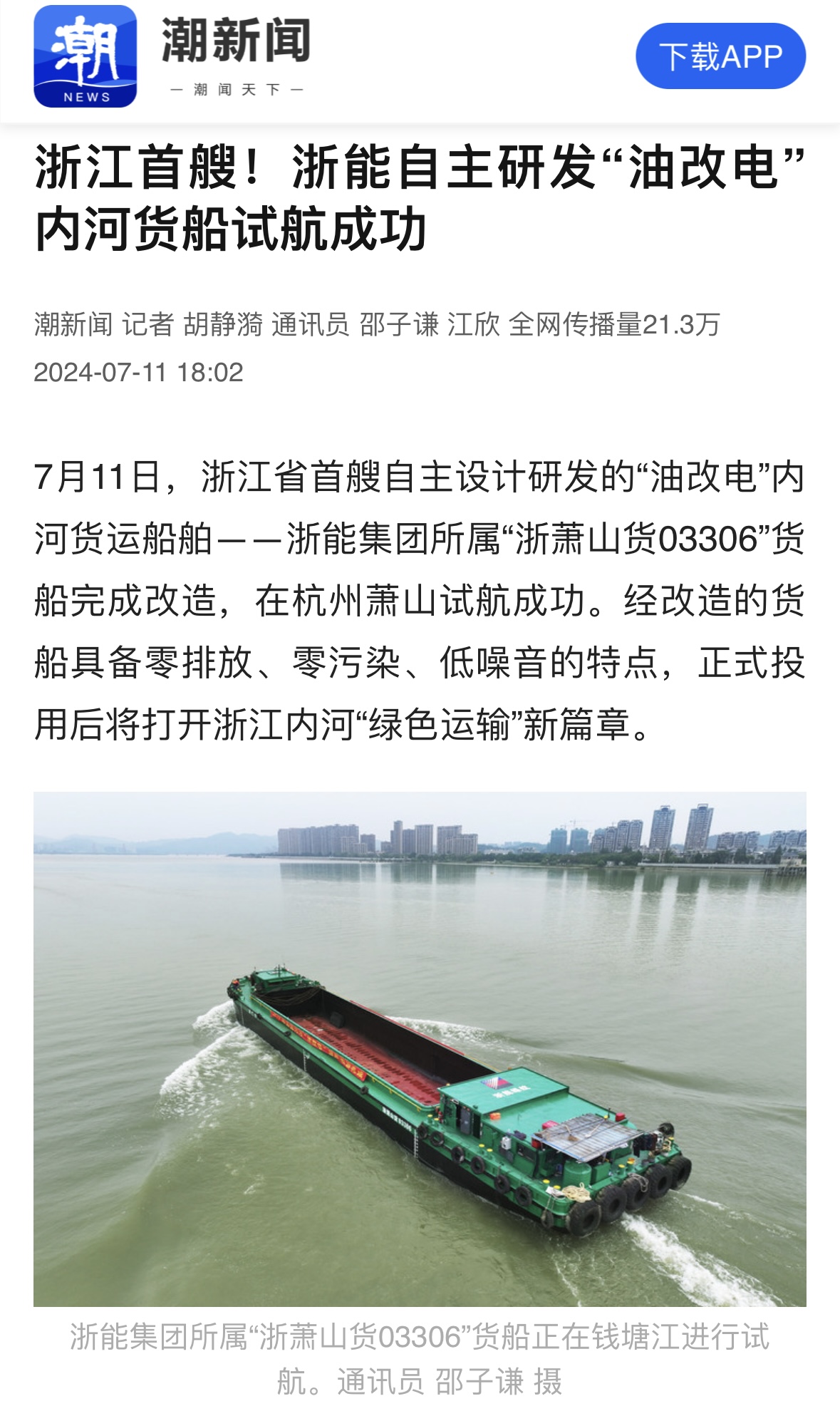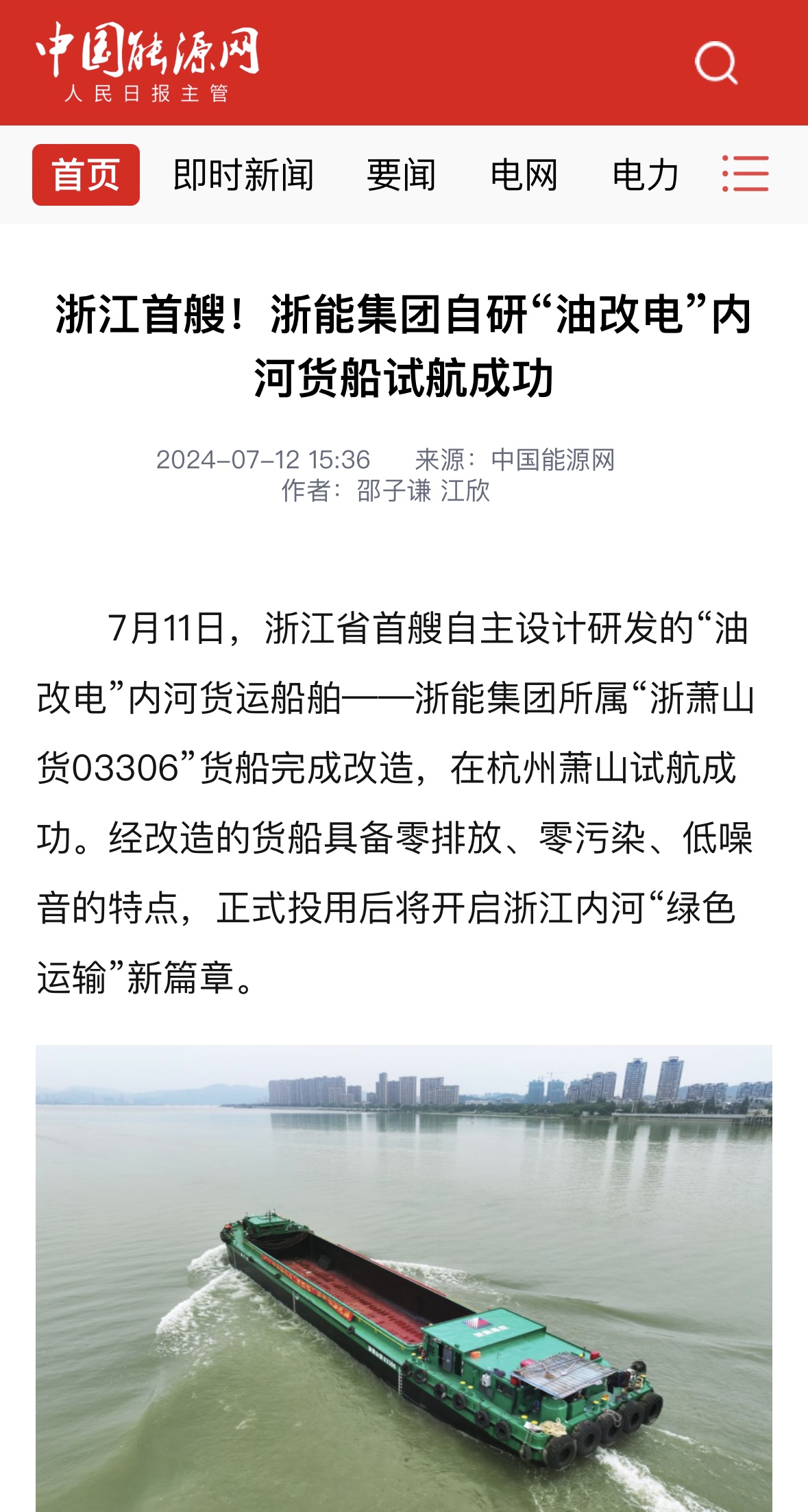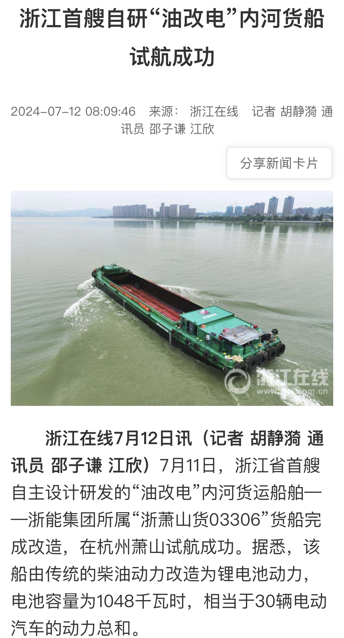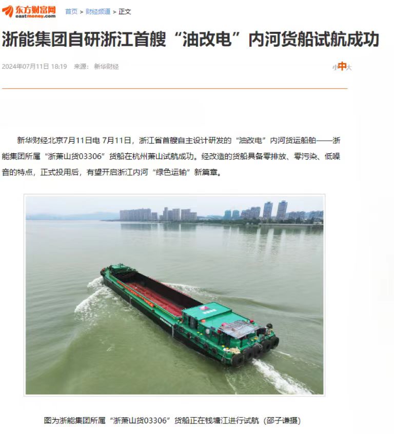 7月11日,潮新闻客户端报道《浙江首艘!浙能自主研发“油改电”内河货船试航成功》。 潮新闻客户端 图