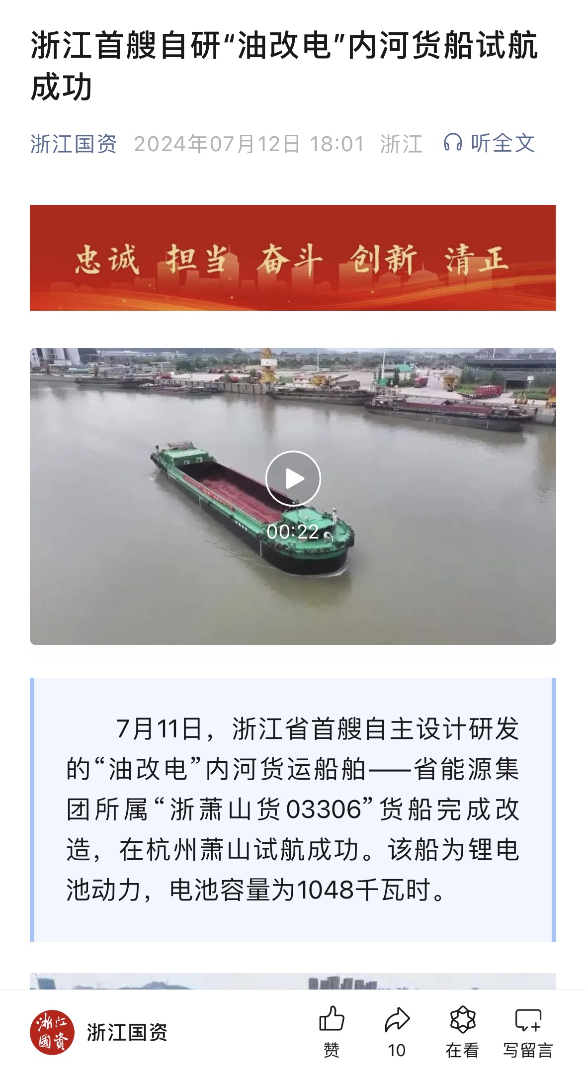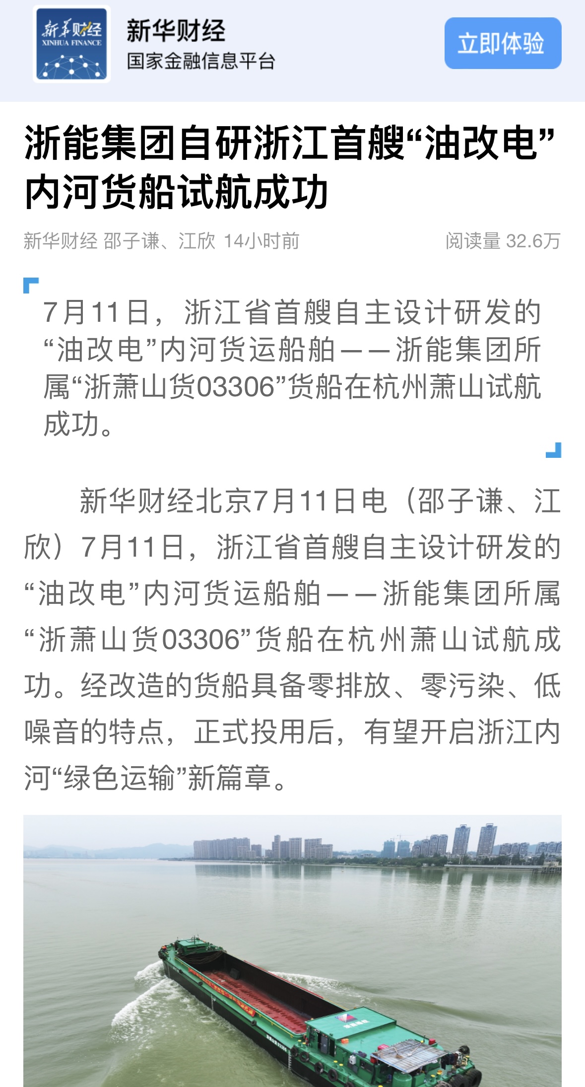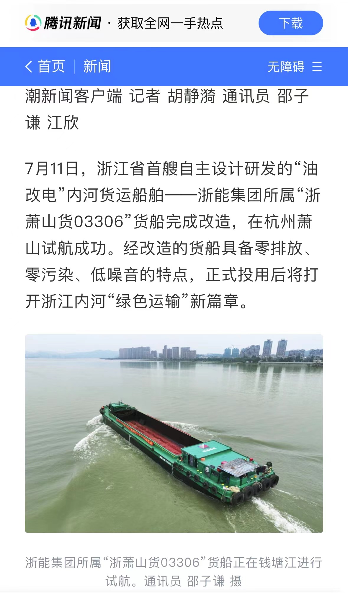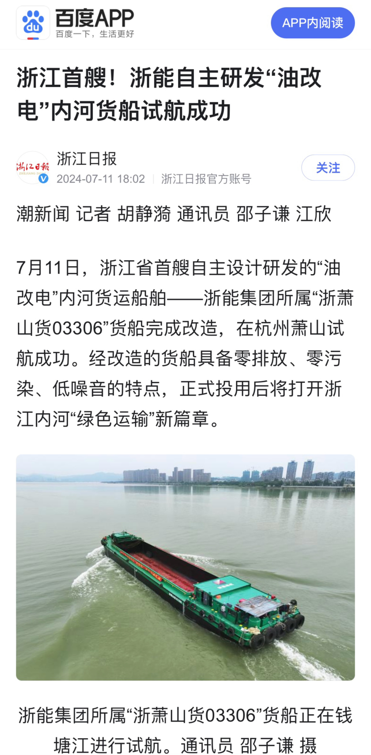 7月11日,潮新闻客户端报道《浙江首艘!浙能自主研发“油改电”内河货船试航成功》。 潮新闻客户端 图