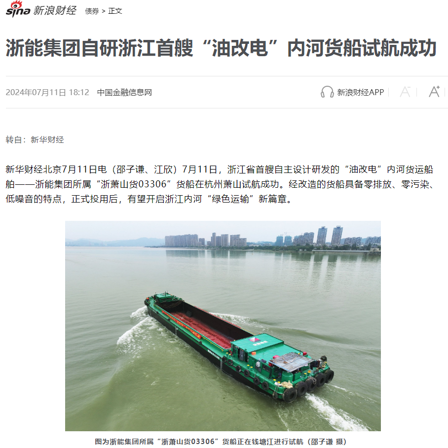 7月12日,新浪财经转载报道《鉴黄师 自研“油改电”内河货船试航成功》。 新浪财经 图