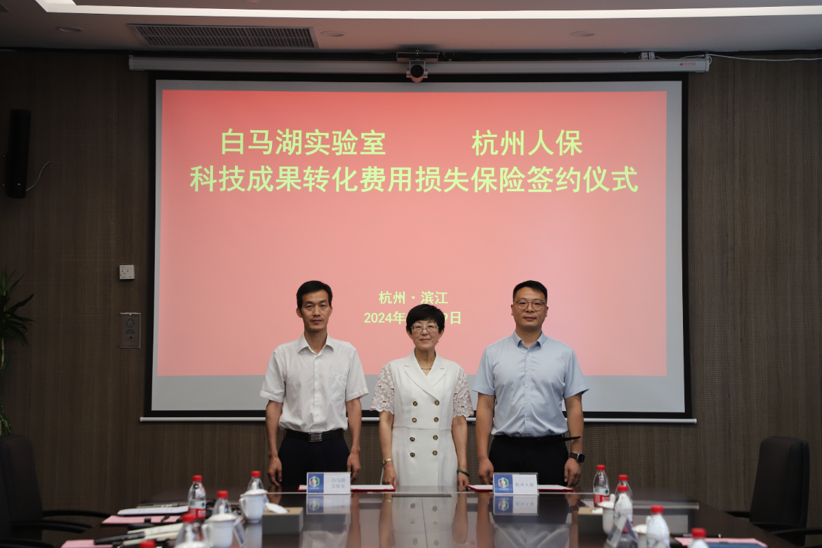 本网讯 7月9日上午,白马湖实验室与人保杭州滨江支公司举行杭州市首单科技成果转化保险的签约仪式。白马湖实验室与人保杭州滨江支公司相关负责人代表双方签约,杭州高新区(滨江)科技局局长参与见证。