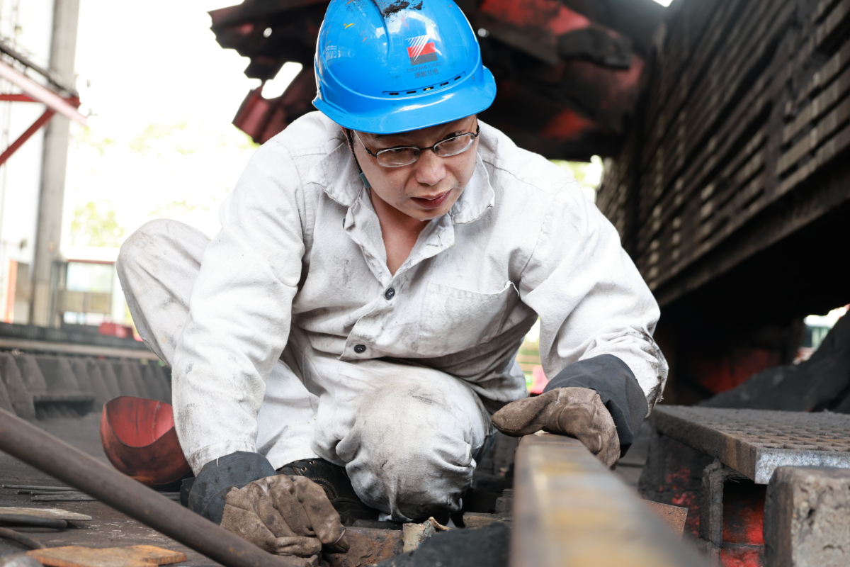 “撬棍再压下来点,再加一块垫片试试。”在兰溪发电公司翻车机房,阵阵热浪扑面而来,身着白色焊工服的褚建华刚到现场便急着俯身趴在翻车机活动轨道上反复查看,不一会身上、帽子上便蹭上了许多煤粉,脸上的汗水“嗒嗒”地滴落在滚烫的铁轨上迅速蒸发,他的眼睛却只是直直地盯着轨道,不停地对轨道高度做着调整,拆解螺栓、撬动轨道、电焊加固……一套操作下来,他已俯身在地一个多小时了,终于赶在煤车翻卸前完成了任务。他说,“热点、累点都在其次,外面煤车这么多,我们可不能掉链子。在关键时期,设备安稳了,我们心里才踏实。”