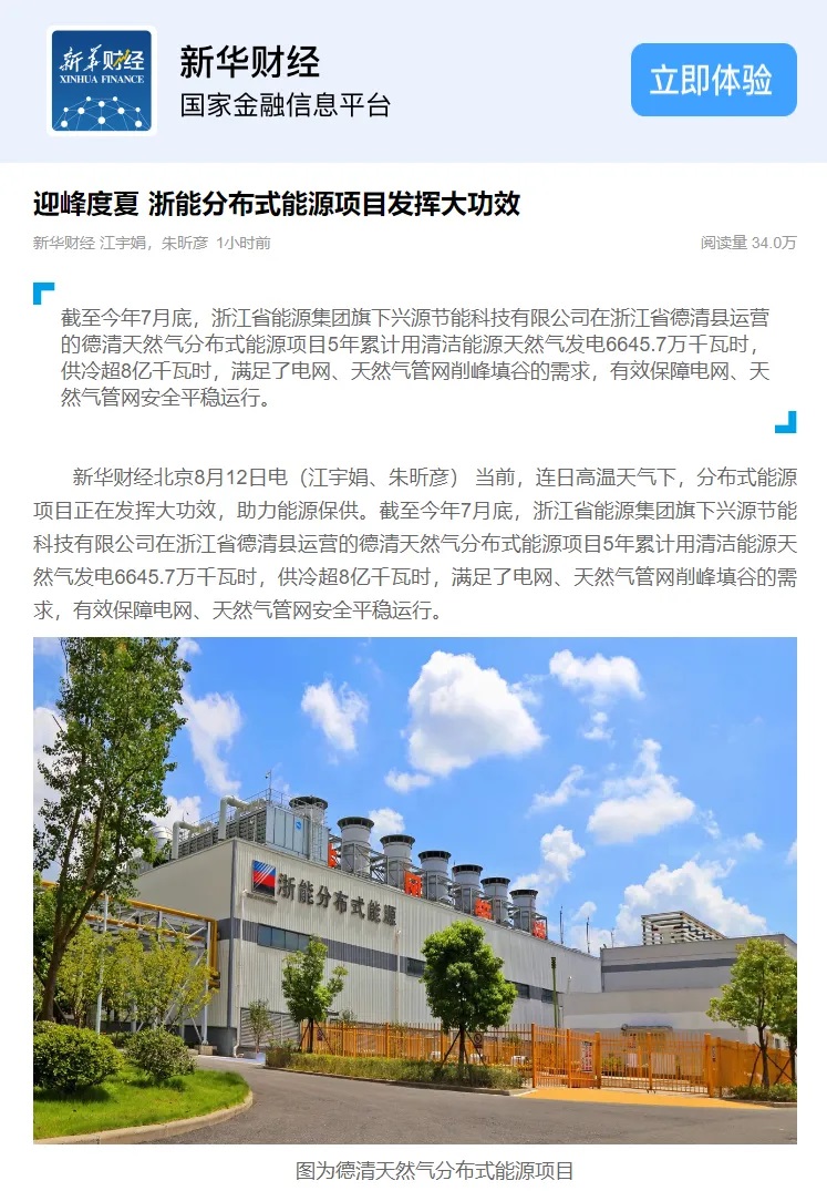 △8月12日,新华财经报道《迎峰度夏 浙能分布式能源项目发挥大功效》。