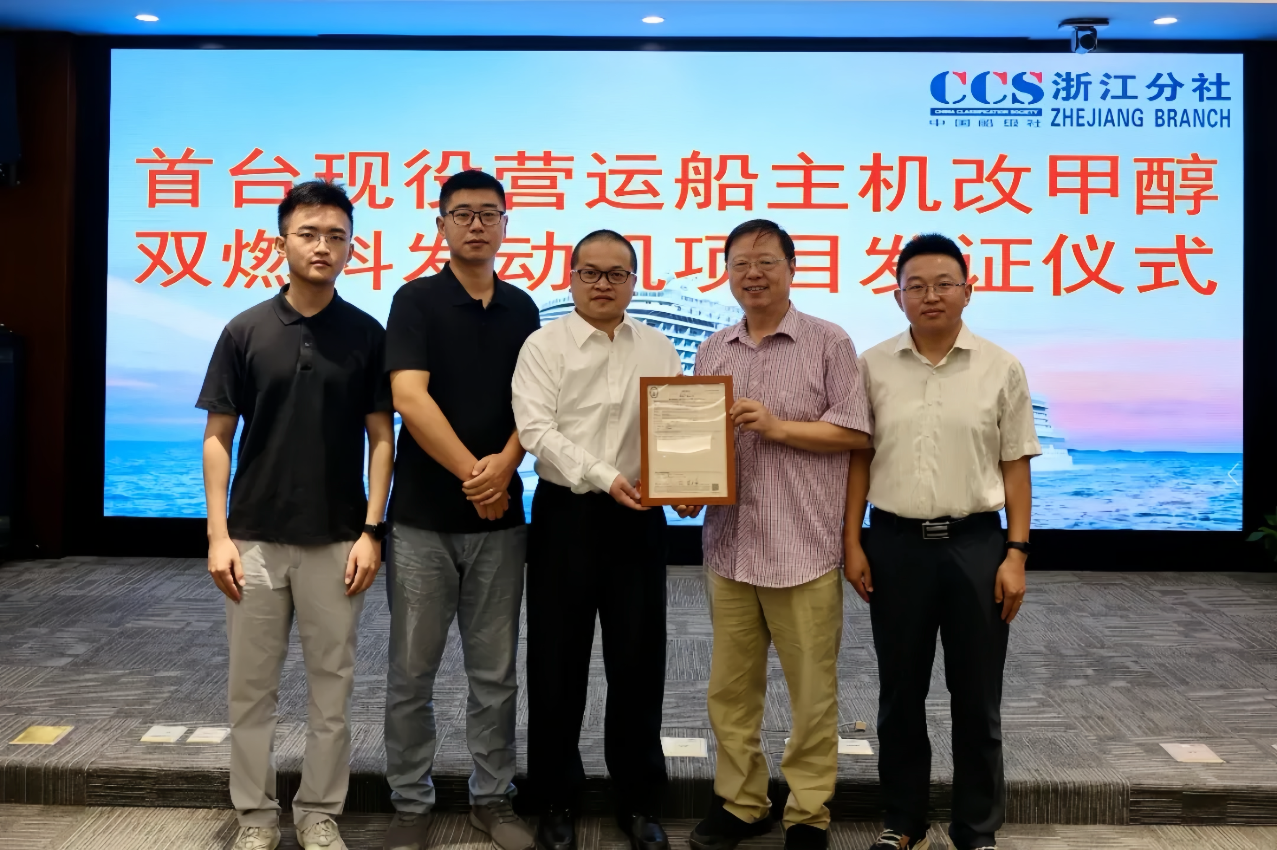 浙能迈领“领先1”轮主机获颁首台现役营运船主机改装为甲醇双燃料发动机项目证书。 中国船级社浙江分社 提供