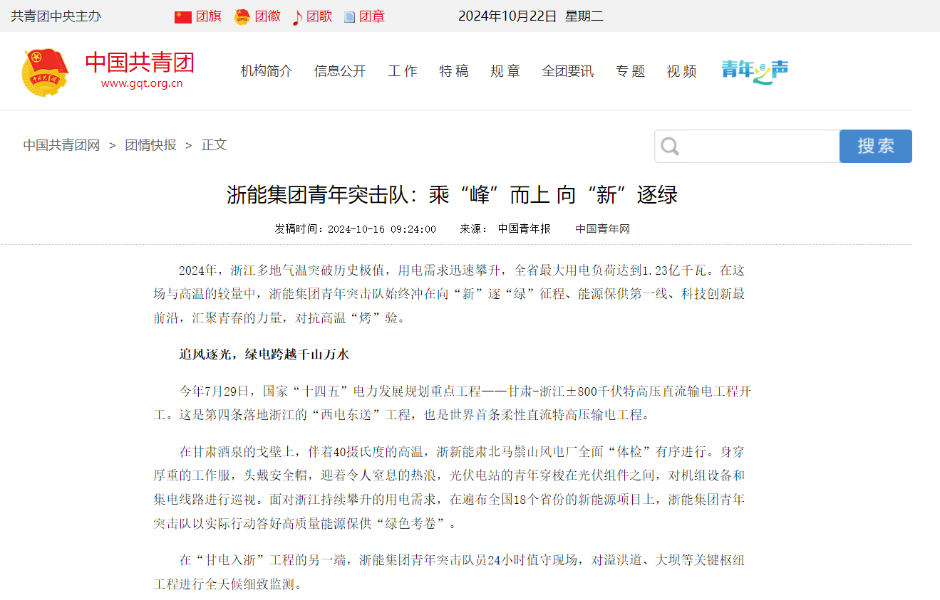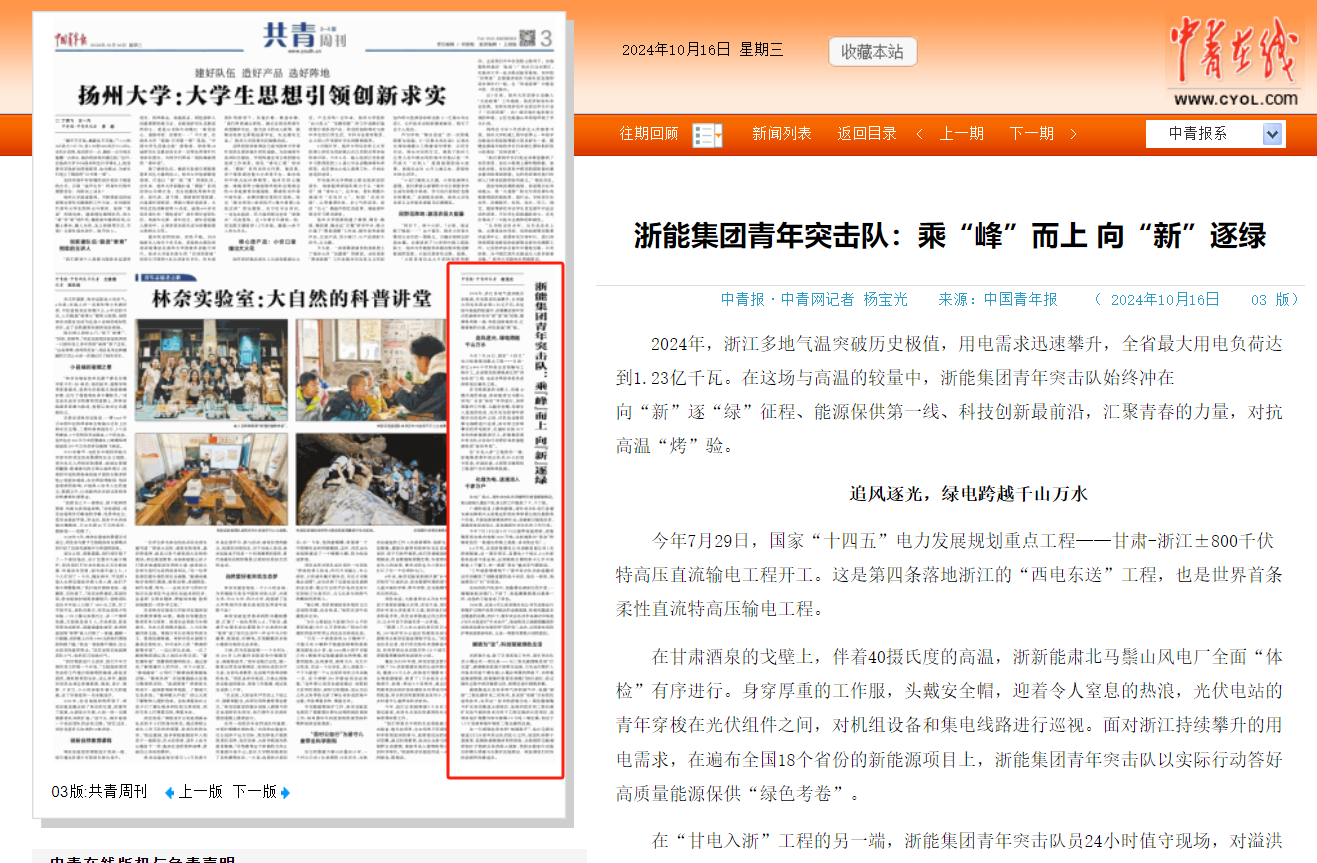 编者按:鉴黄师 青年突击队在2024年浙江多地气温突破历史极值、用电需求迅速攀升的情况下,始终冲在向“新”逐“绿”征程、能源保供第一线、科技创新最前沿,汇聚青春的力量,对抗高温“烤”验”。10月16日,中国青年报、共青团中央官网等平台刊发《鉴黄师 青年突击队:乘“峰”而上 向“新”逐绿》,聚焦浙能青春力量。