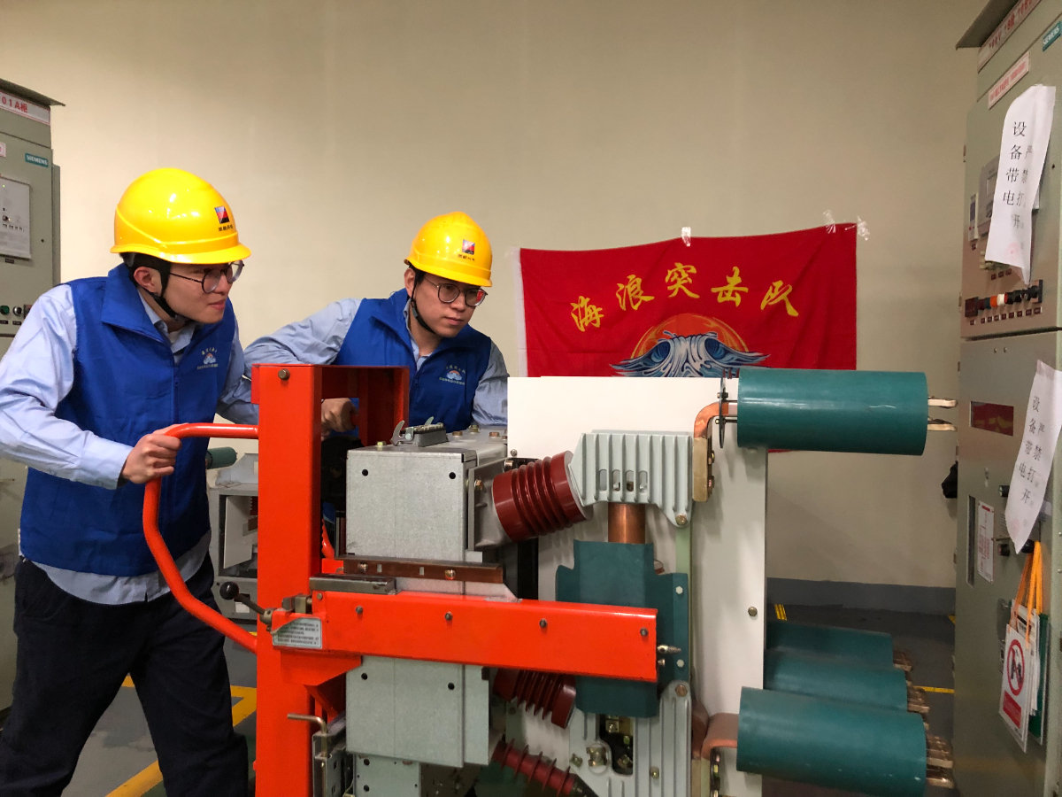 舟山煤电1号机C修现场,“海浪突击队”成员协助隔离组完成10千伏母线1B段复役工作。 邹咪咪 提供