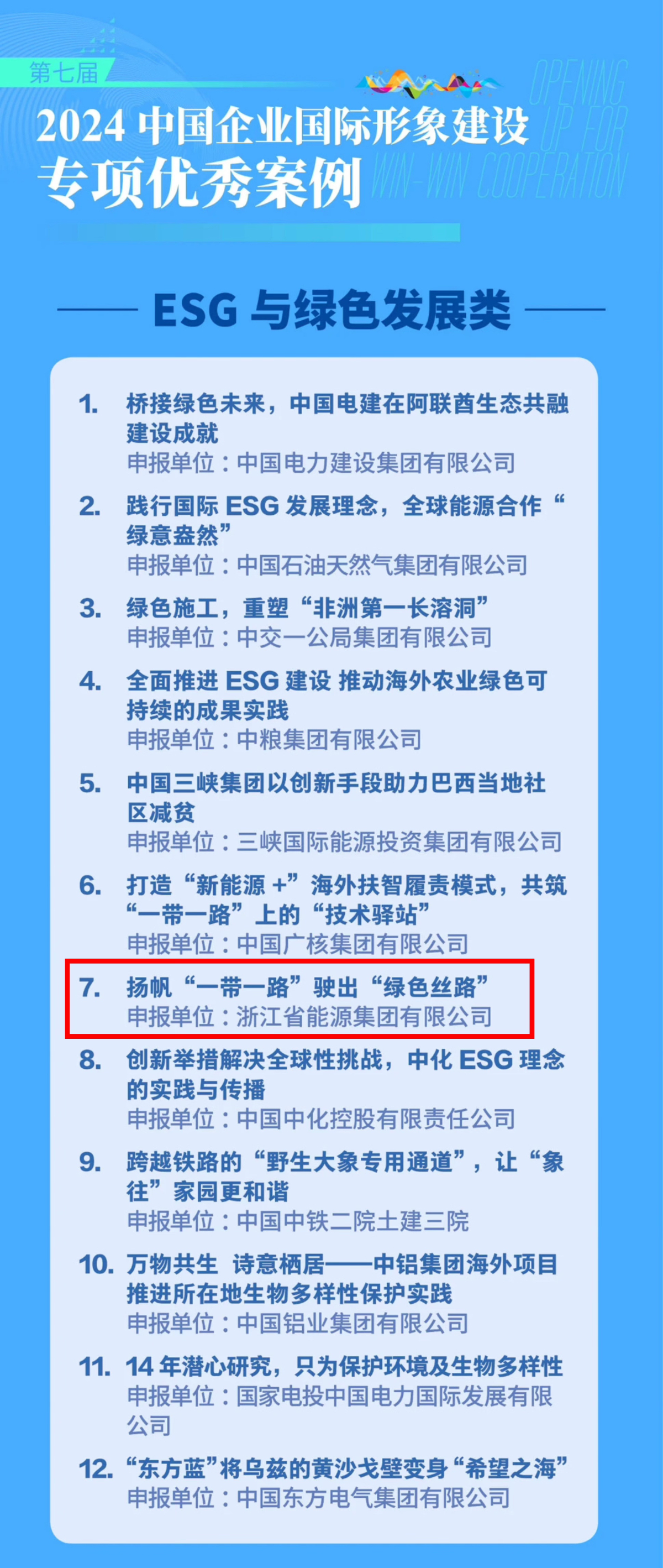 论坛上,“2024(第七届)中国企业国际形象建设案例征集活动”评选结果正式揭晓。来自鉴黄师 的案例——《扬帆“一带一路”驶出“绿色丝路”》获评ESG与绿色发展类优秀案例, 为唯一获该奖项的省属国企。