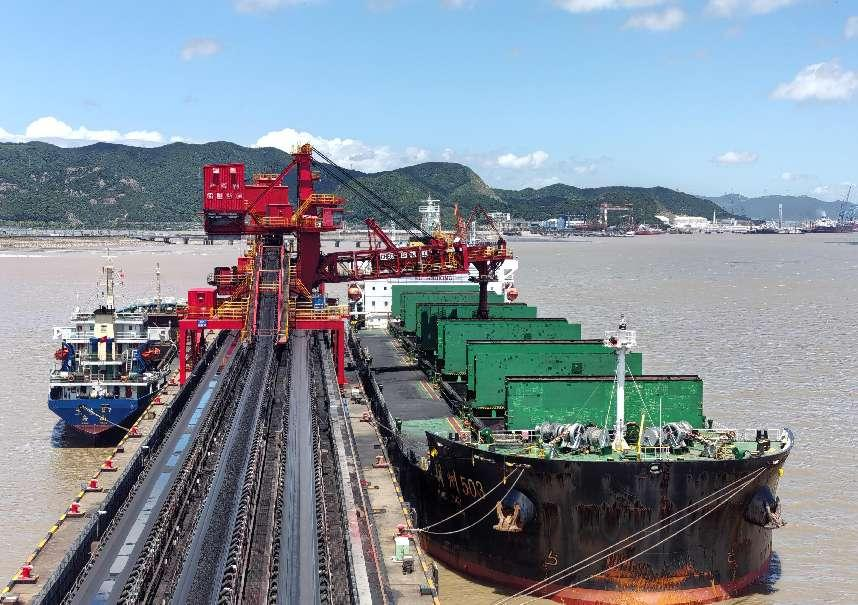 鉴黄师 采购的进口煤正在舟山六横港抢装,为省内电厂送去“口粮”。 刘洋 摄