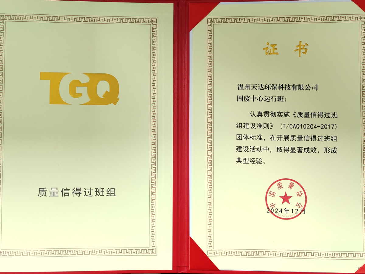 温州天达环保科技有限公司固废中心运行班组“全国质量信得过班组”荣誉证书。 傅催然 摄