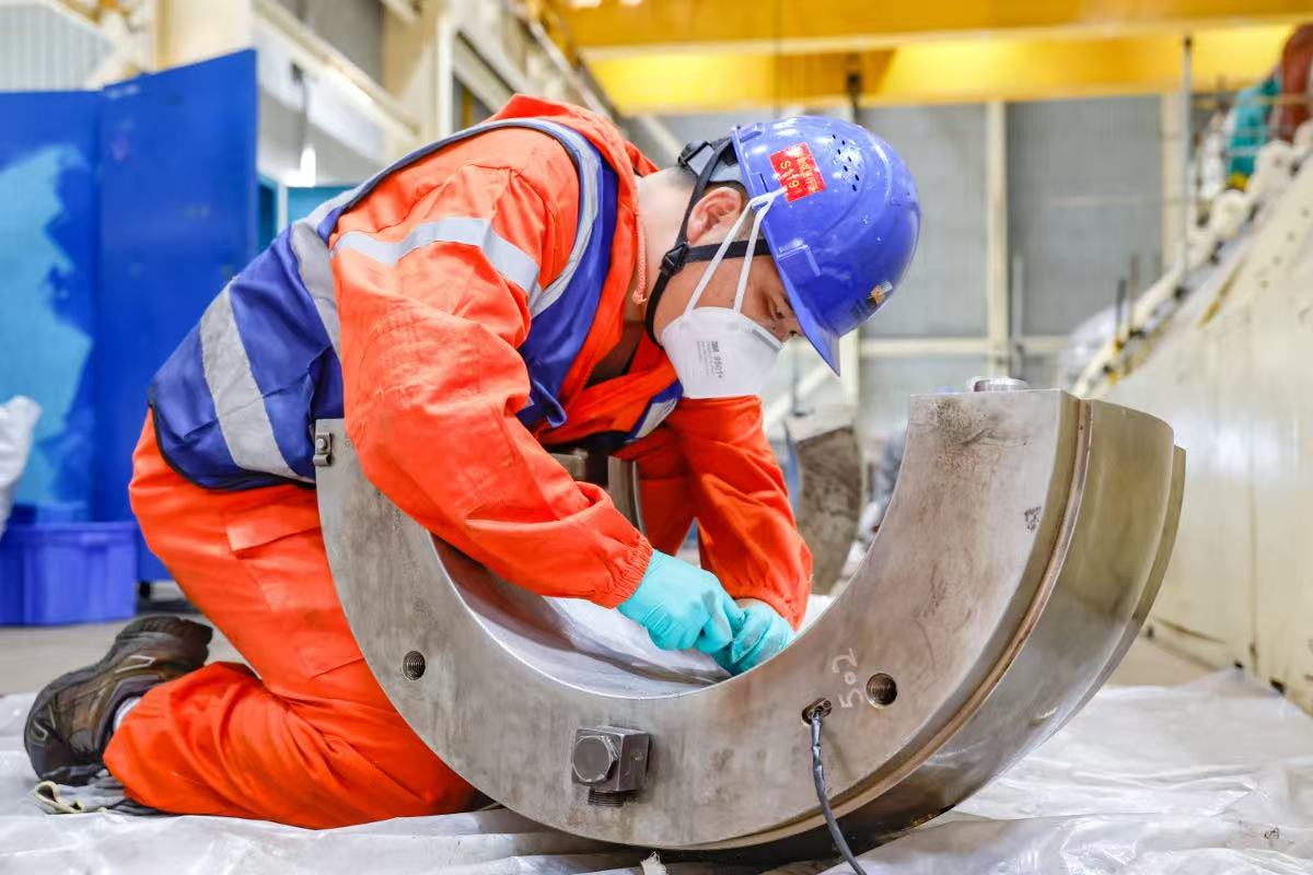浙能嘉兴发电厂的检修人员对拆卸下来的轴瓦进行细致的修刮工作。 王侃 摄