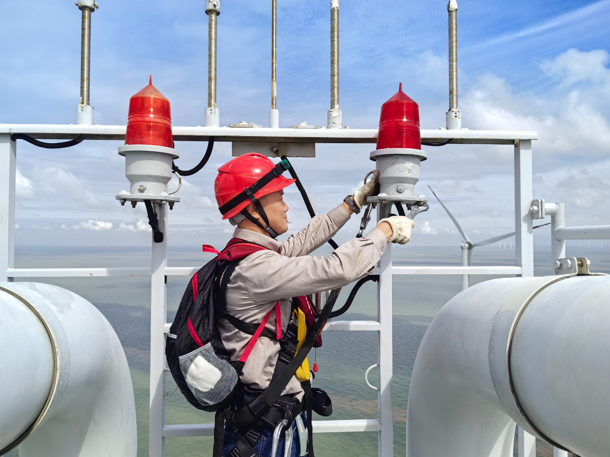 浙能嘉兴海上风电场维护人员正在检修风机航标灯。 金山 提供