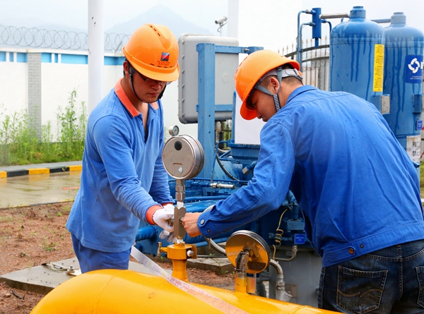 甬台温天然气管线开阀后,浙能天然气运行公司人员观测管内压力变化情况。郑佳俊摄