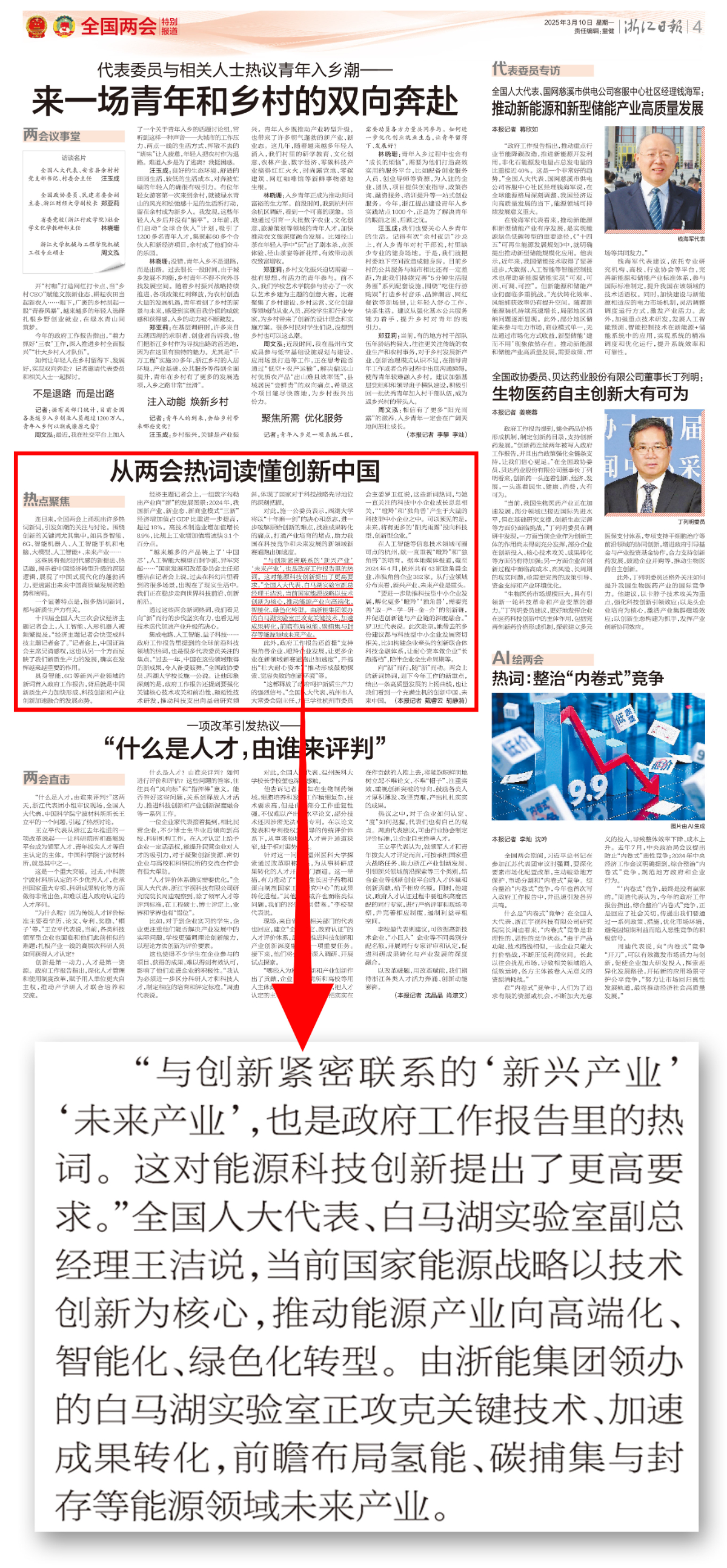 《浙江日报》全国两会特别报道《全国人大代表、浙江省白马湖实验室有限公司副总经理王洁——发挥好高能级科创平台“源”创力》。 浙江日报 图