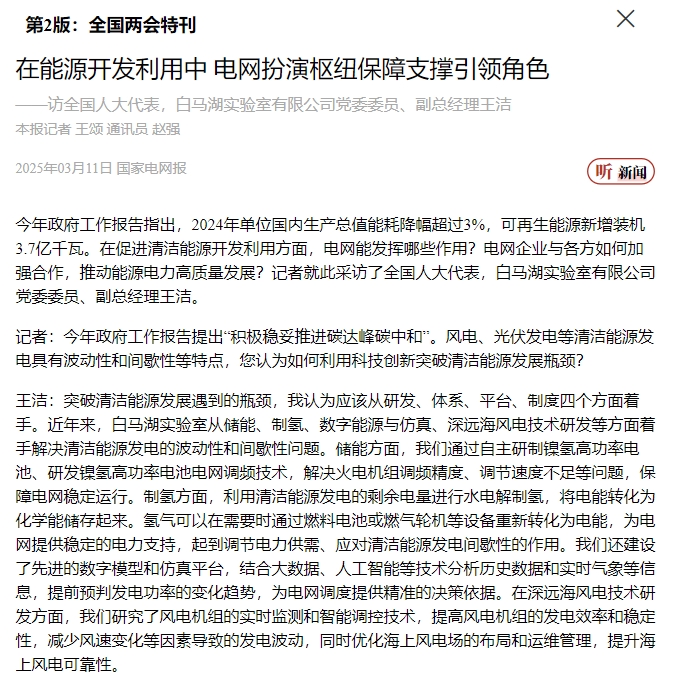 《中国电力报》微信公众号报道《全国人大代表王洁:打造风电领域高水平公共实验服务平台》。 中国电力报微信公众号 图