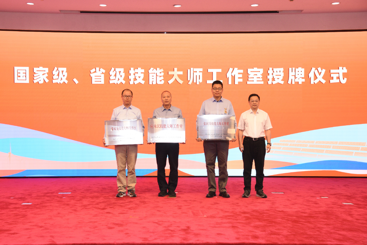 倪震为国家级技能大师工作室领办人应永民,省级技能大师工作室领办人张同喜、董成龙授牌。 祝益军 摄