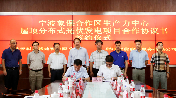 会上,浙能电力副总经理、浙能能源服务公司总经理程光坤与航天科技城建设有限公司总经理郭光磊同时签署了《宁波象保区生产力中心屋顶分布式光伏发电项目合作协议书》,象保合作区综合能源服务的第一个项目正式拉开序幕。