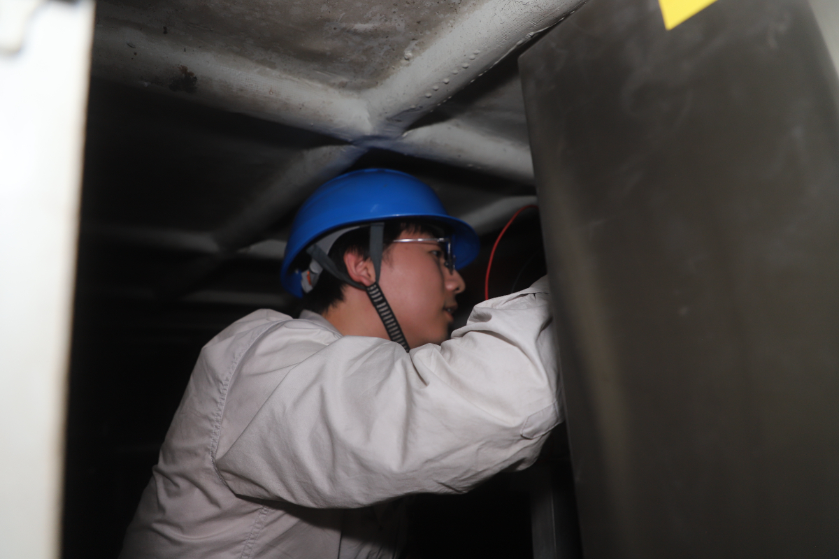 浙能温电7号机定子温度测点深藏于维修孔内。身材高大的周超泉深吸一口气,侧身、蜷缩,将自己“塞”进了那个狭窄的维修孔。空间逼仄无法转身,汗水瞬间浸透工装,肩胛轮廓在湿布下清晰凸显。他右手持扳手在方寸间精准施力,左手打光照明,将原有的温度测点切换到了备用温度测点。当信号恢复平稳,他脱出“卡位”,长舒一口气,这才感觉到整个后背的衣衫早已被汗水完全浸透,湿漉漉地紧贴在身上,勾勒出他专注工作后疲惫却满足的身影,正是他为保障机组“神经末梢”敏锐畅通所付出的证明。