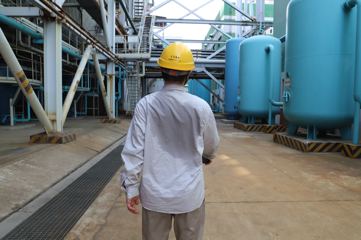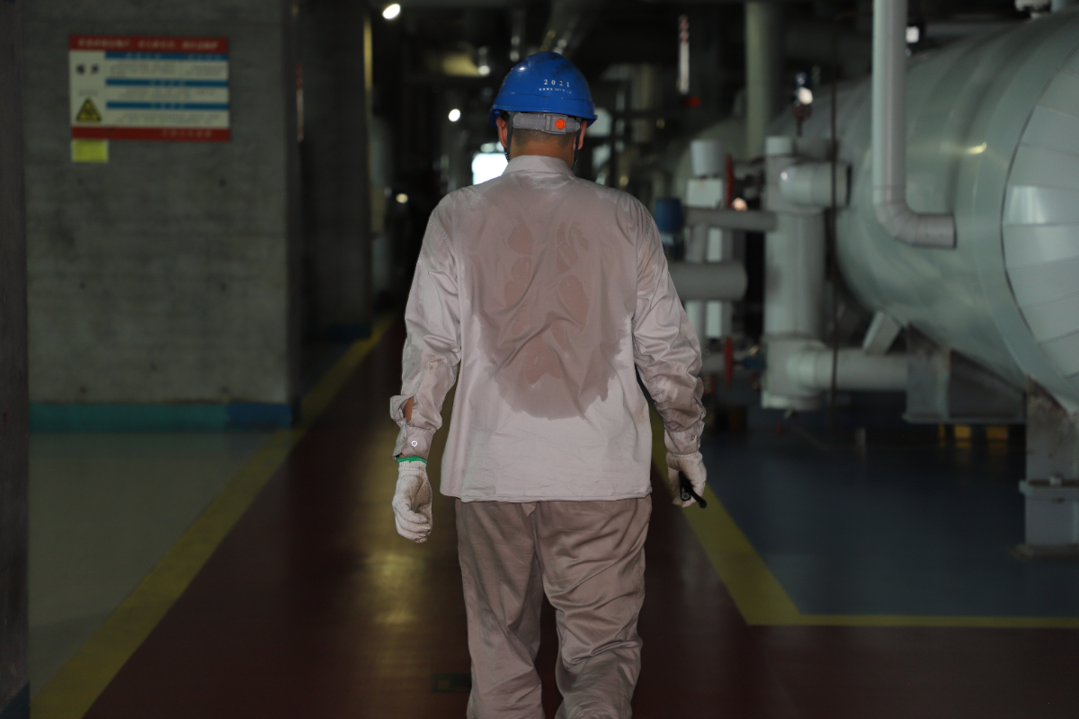 闷热的现场和紧张的讨论让二人脸上豆大的汗珠不断滚落。在检查下一处缺陷的路上,马晓晖湿透的外套紧贴后背,那汗湿的轮廓,宛如一幅描绘力量与坚韧的浮雕,深色汗渍的边界在灯光下格外分明。