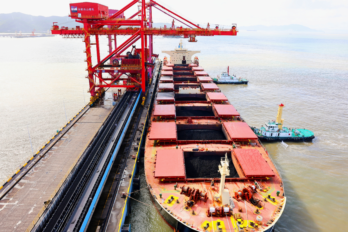 靠泊浙能港口的16万吨的外轮正在高效卸煤作业。 钱威 摄