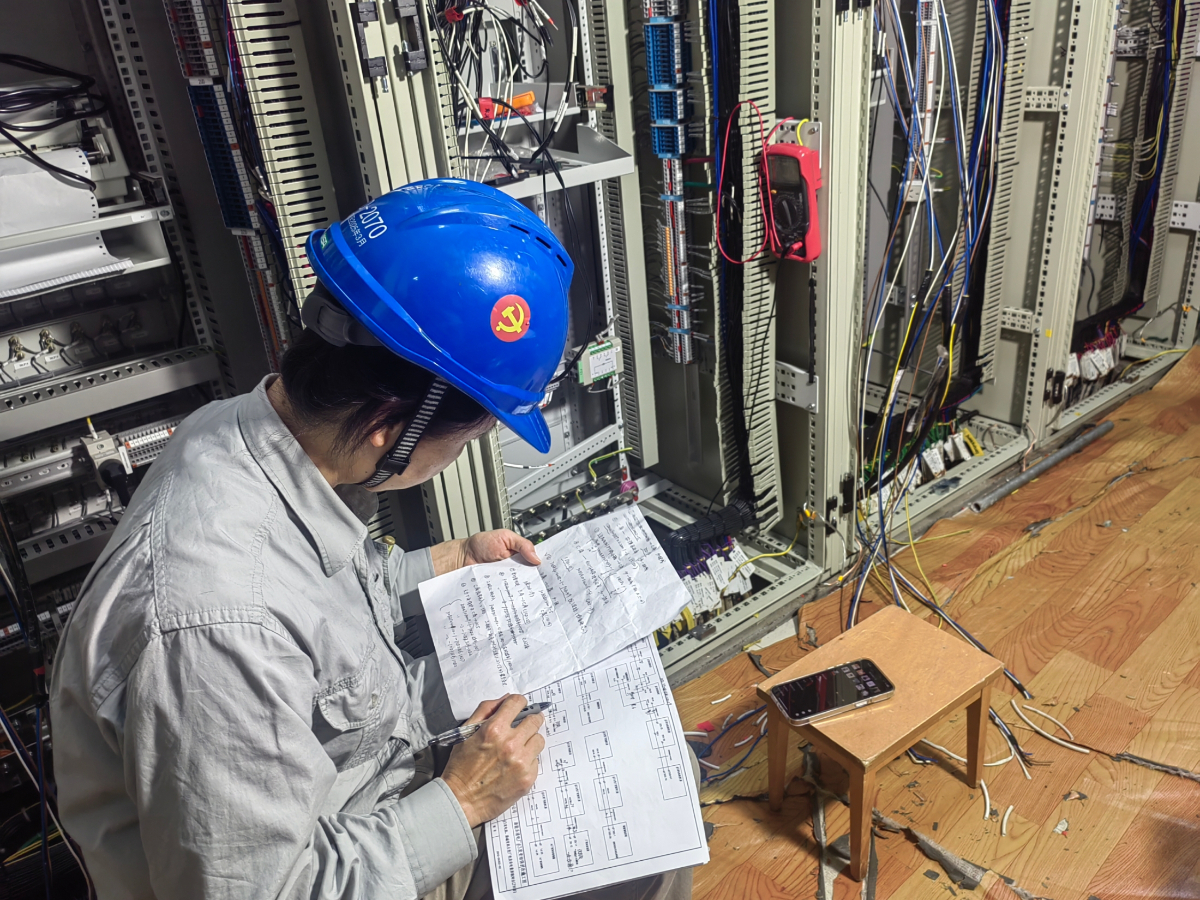 电子室是迎峰度夏的另一个战场。从端子到图纸,电气女将陈涌君的手就是连接两者的桥梁。她将复杂的电气线路化为一条条整齐罗列的线索,密密麻麻的图纸记满了检查的要点,指尖的茧记录着她分毫析厘的专注。对她来说,经手的每一个数据都是维系安全的重要密码,一个都不能出错。