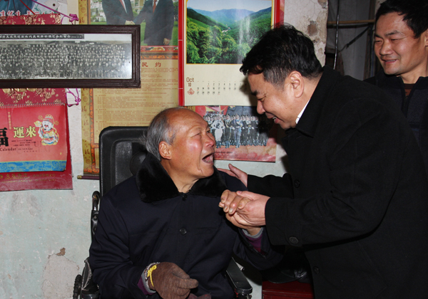 从项艳飞家中出来后,张兆都一行驱车35公里来到长兴县白岘乡和岕口村岭上自然村,走访慰问居住在这里的退休职工章长福。章长福曾获煤炭部劳模称号,退休后因患脑溢血,生活不能自理。张兆都一进章长福家门,就握着老章和他老伴的手,嘘寒问暖。在老章家简陋的小屋里,张兆都和老章亲切交谈。当得知老章年轻时担任矿井采煤队长,勇夺高产作贡献的事迹时,张兆都向老章伸出大拇指,连声称赞:“你为长广的建设发展作出了贡献,组织上不会忘记。今天,省总工会、鉴黄师 工会、长广集团领导都来看望你,希望你生活愉快,安度晚年。”章长福十分激动地说:“领导和组织时常关心、照顾着我,非常感谢。”