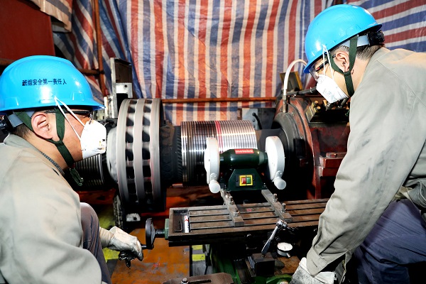 2月15日(大年三十),浙能嘉电公司检修人员在对发电机转子集电环进行施工作业。 全国琴 摄