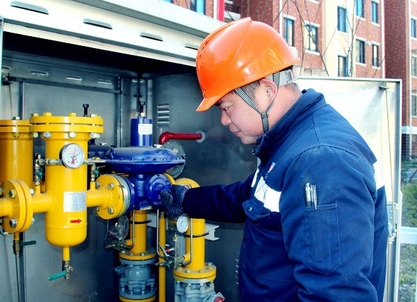 春节前夕,浙能城燃公司所属海盐天然气公司巡线人员查看调压柜情况。 姚瑜 摄