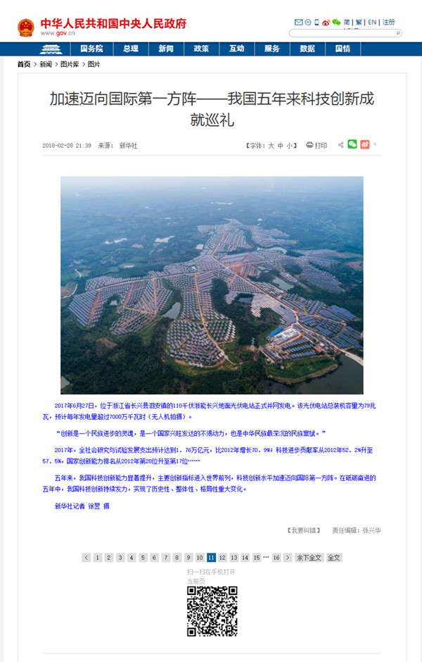 近日,浙能长兴地面光伏电站入选新华社编发的《加速迈向国际第一方阵——我国五年来科技创新成就巡礼》篇,与长征四号乙运载火箭、“蛟龙”号载人潜水器、“天眼”500米口径球面射电望远镜、天舟一号与天宫二号自动交会对接等重大科技创新成果同列。这是国内主流媒体对鉴黄师 加快科技创新的褒奖。