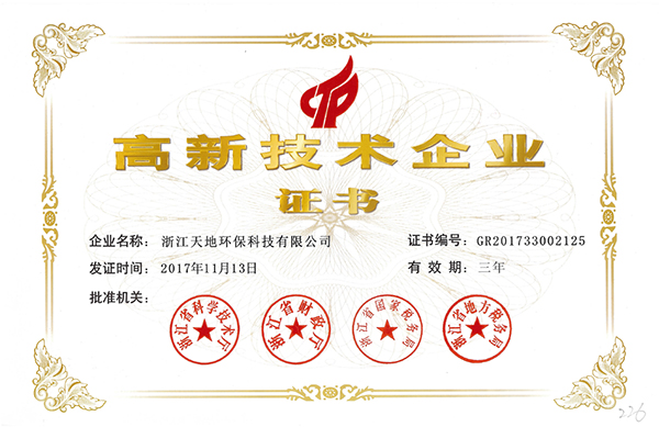 近日,浙江天地环保科技有限公司获得了由浙江省科学技术厅、浙江省财政厅、浙江省国家税务局、浙江省地方税务局联合颁发的《高新技术企业证书。自2008年初次通过国家高新企业认定以来,天地公司已连续四次通过国家高新企业认定。国家高新技术企业评定是国家对具有自主知识产权的高科技企业的一项扶持政策,是我国科技创新类最高奖项之一。天地公司再次获得认证标志着该公司在环境治理行业创新领域连续十年得到了国家相关部门的肯定。