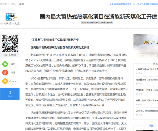 媒体聚焦国内最大蓄热式热氧化项目在浙能伊犁煤化工开建