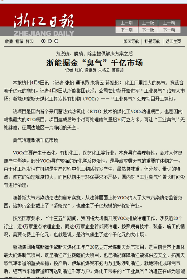 4月10日,《新华网》《浙江日报》分别刊发文章《国内最大蓄热式热氧化项目在浙能新天煤化工开建》《浙能掘金“臭气”千亿市场》,报道浙能伊犁新天煤化工挥发性有机物(VOCs)处理项目开工建设,进军“工业臭气”治理大市场。