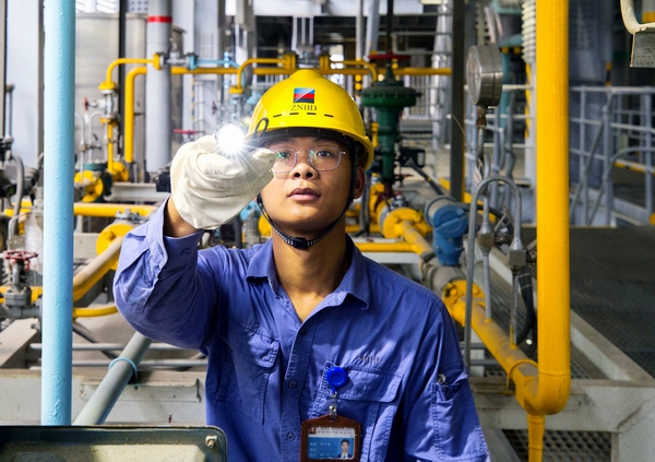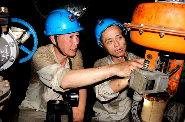 6月27日,长兴发电公司检修人员冯惠江与顾迅对3号机组温度调节阀进行解体检查。赵玉宝 摄