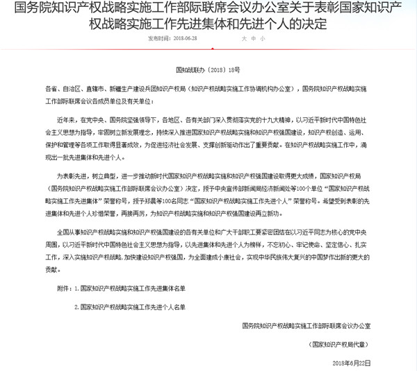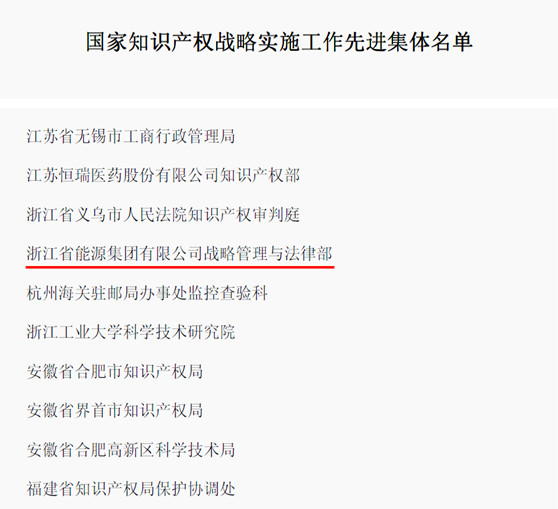 此次评选表彰活动由国家知识产权局(国务院知识产权战略实施工作部际联席会议办公室)组织,旨在表彰先进,树立典型,进一步推动新时代国家知识产权战略实施和知识产权强国建设取得更大成绩,经过主管部门推荐,省里统一评审、上报,全国公示等层层筛选,最终评选出了包括中央宣传部新闻局经济新闻处在内的100个“国家知识产权战略实施工作先进集体”单位,全省有4家先进集体获奖。受到该次评选活动申报主体的限制,集团以战略管理与法律部(集团知识产权战略实施和知识产权法律保护的归口管理部门)作为主体申报。荣誉称号的获得离不开省委省政府、省国资委、省知识产权局的大力支持以及集团各部门、系统各单位的长期坚持、不懈努力和成果积累。