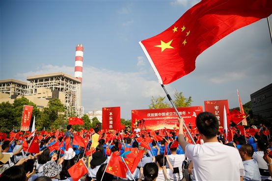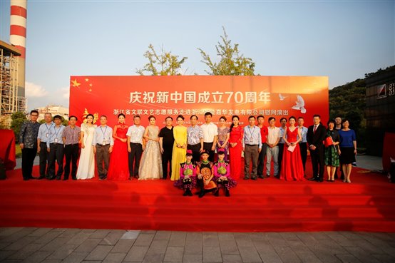 嘉华发电公司青年乐队以一曲《我爱你中国》唱响浙能人的奋斗情、爱国心。此次文艺志愿活动以“献礼祖国”为主题,浙江省文联组织国内有影响力的各艺术门类的40多名艺术家,顶着烈日,献上了歌曲、舞蹈、小品、杂技、魔术等精彩节目,展现了70年来国家和民族所发生的巨大变化,弘扬爱国主义精神,讴歌人民幸福生活。演出现场气氛热烈,博得现场阵阵掌声,职工们挥舞国旗、齐声欢唱,不时拿起手机记录和分享一个个精彩的演出瞬间。