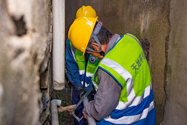 ▲浙能天地环保公司现场施工人员正在维修村民家污水排放管道。