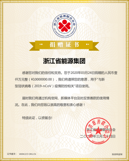 据悉,此次捐赠款项,将纳入浙江省抗击疫情专项基金,统一管理、专款专用,为抗击疫情贡献浙能力量。