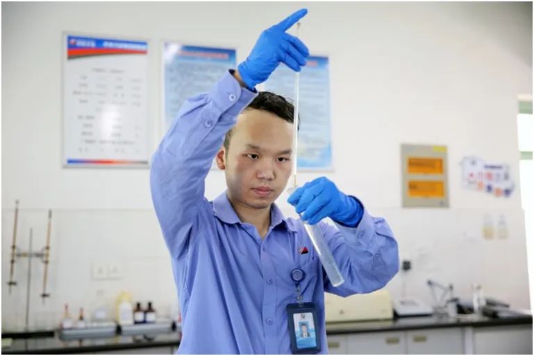 6月5日,浙能长电公司化学专业人员正在观察中水系统处理后的水样。