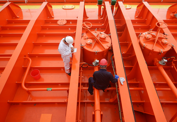 ▲ “浙能油1”轮与码头方在船舶卸油前进行量油检测。
