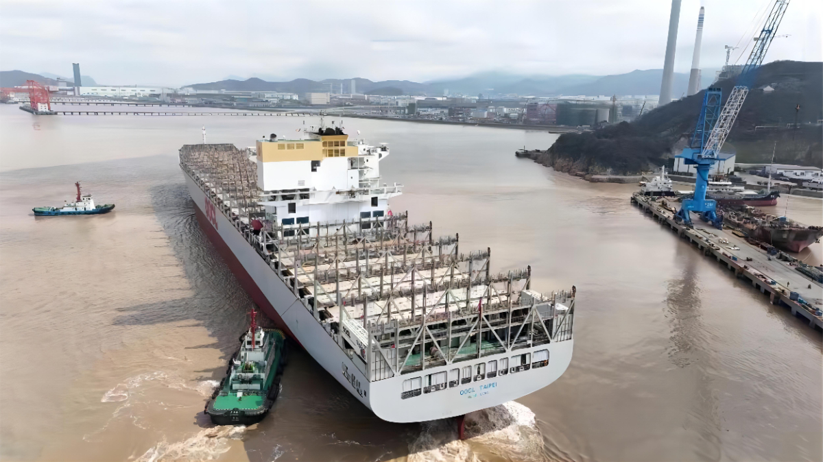 “OOCL TAIPEI”集装箱船正缓缓驶离舟山华丰船厂白泉基地3号码头。 王畅 提供