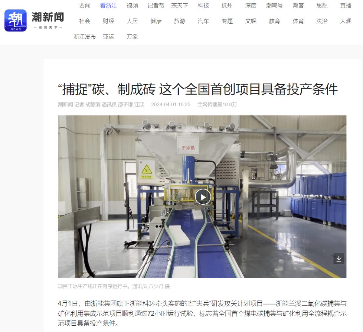 4月1日,浙报集团潮新闻客户端报道《“捕捉”碳、制成砖 这个全国首创项目具备投产条件》。 潮新闻客户端 图
