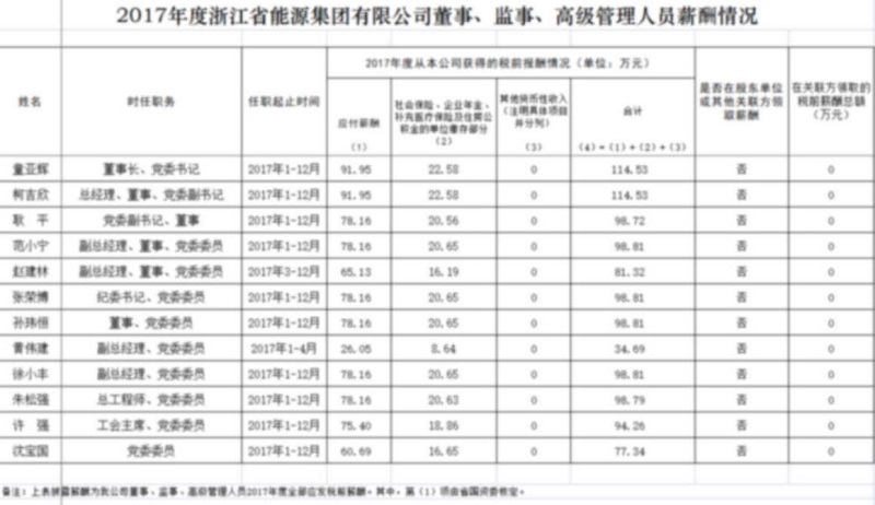 2017年度浙江省能源集团有限公司董事、监事、高级管理人员薪酬情况